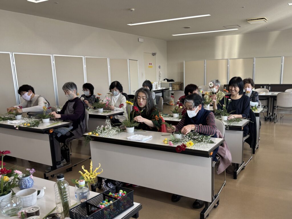 参加された18名の方々は、初めは講師や周りの方を参考に進めていましたが、徐々に形になるにつれて自分なりの花の組み合わせを楽しみ、とても素敵なお花が完成しました。